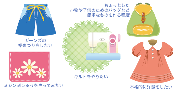 「ミシンが欲しい」、「ミシンに興味がある」と思われた方は、多分、当面ミシンを使ってやりたいこと、作りたいものを頭に思い描かれていると思います。 ちょっとした小物作りや、お子様の入学準備などから、キルトや本格的な服作りまで、最初の目的は様々だと思われます。 ミシンには機能面、価格面で差があるため、使用目的を考えて選ぶことが大切です。